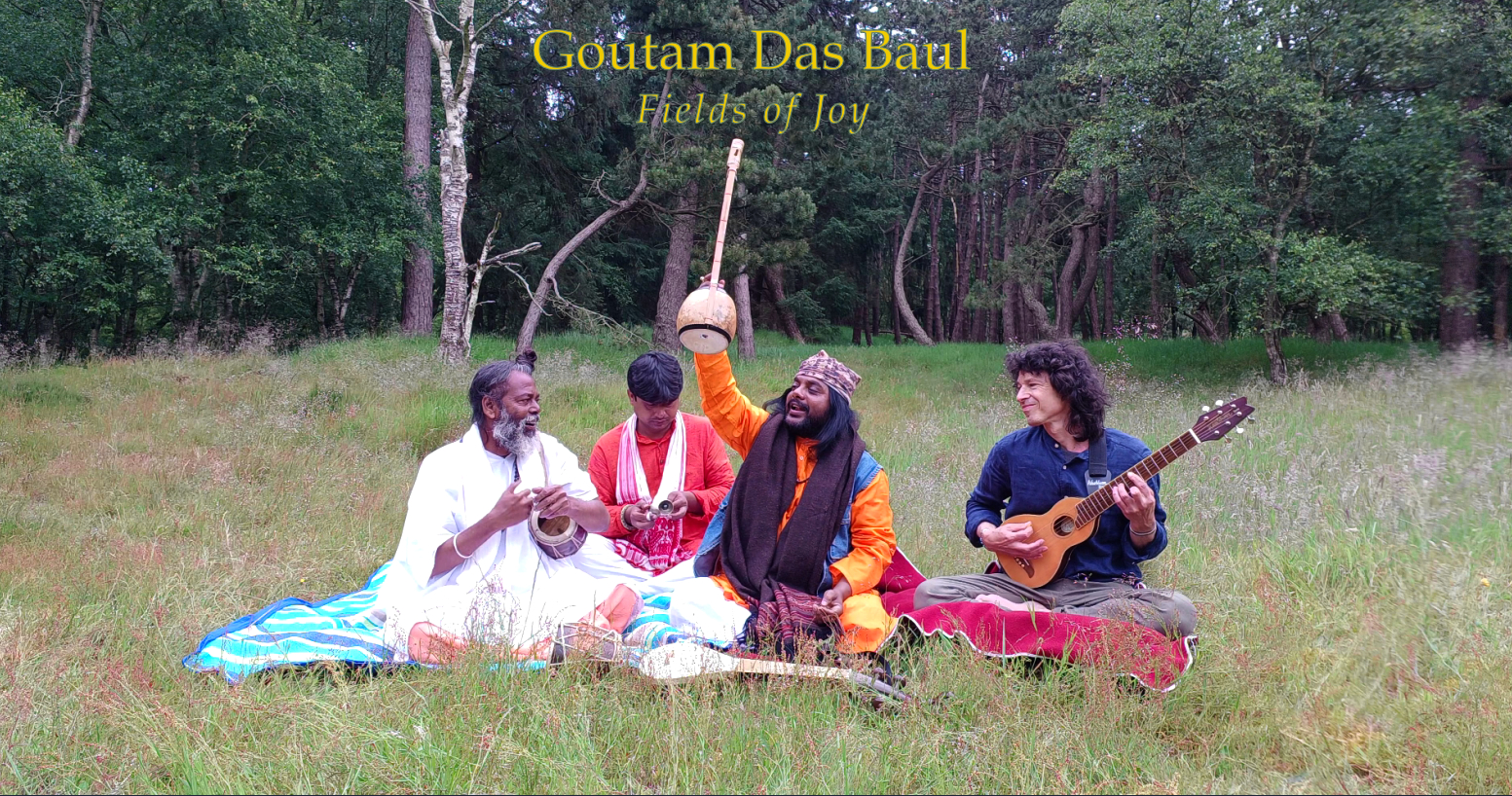 “High in the sky above a beautiful heathland in Drenthe (Holland) a skylark sings. Below him strolls a colourfully dressed group with special musical instruments. They seem to be looking for a suitable place to make music together. They love purity and prefer to live close to nature. These are three Bauls. Spiritual gurus from West Bengal (India) and one passionate musician from Groningen. Bauls have been singing their wise songs for hundreds of years. They advocate equality, respect and love. Bauls will tell you that you should not look for God in a mosque, temple of church, but you should find Him within yourself. They are real bridge builders. These four men want to build a musical bridge today, not only between religions. The skylark is curious, and it seems he wants to make clear with his beautiful song, that this is the right place. And if possible, he wants to join in. The men settle down in the grass. While they tune their instruments the lark takes off. We have given these beautiful recordings the name: Fields of Joy. We hope you will enjoy it as much as we do.”